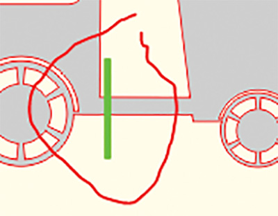 - Use the Knife tool to “cut” the engine section from the rest of the train. Ensure you make this vertical cut closer to the engine than to the other car, as illustrated by the green line in FIGURE 4. (To make this easier, try holding down the Ctrl key after clicking the first point; this will force the line to be vertical.)