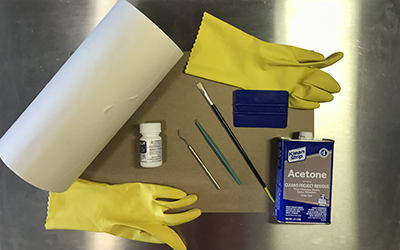 The most technically difficult part of the process is creating the mask. More on that in a moment. FIGURE B illustrates the small number of tools and supplies needed for this operation—etching cream, rubber gloves, a small art brush, weeding tools, squeegee, and acetone.