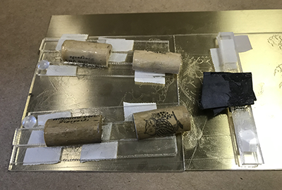 Note: Rubber cement not only works as a good adhesive, but it also provides a grippy surface on the corks, helping to prevent the product from sliding out of position.