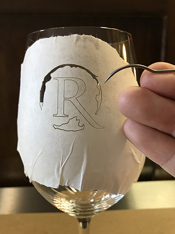 Note: I could have used my laser to imprint the Reidel glasses; however, in my experience, I have found the laser tends to fracture the glass, leaving a rougher finish. Even with laser tape designed to reduce the fracturing, the finish will not feel as smooth to the touch, nor will it be as opaque as acid glass etching or sandcarving. In this operation, a laser will only be used to cut the masking on the glass.
