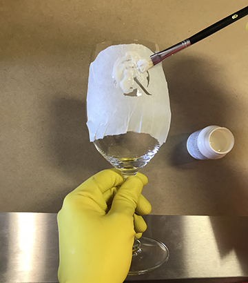 After lasering all the glasses, I used a weeding tool to carefully remove pieces of the laser masking tape (FIGURE F). For reasons I’ll explain momentarily, I would recommend lasering and weeding all of the glasses first before moving to the next step: applying the acid etching cream.