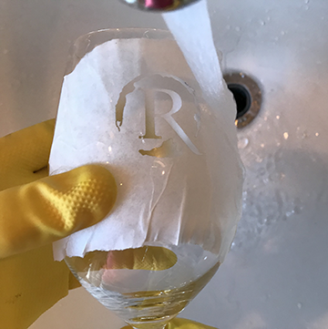 While rinsing the glasses, I removed the laser masking at the same time. Using a clean terry cloth towel, I dried the glasses to prevent water spots.