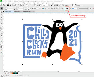 The first step is to select the artwork and add an outline. To begin, select all of the artwork and click the Create Boundary button in the property bar (FIGURE E). This will create an outline around every object and weld them together. FIGURE F shows what the outlines look like without the original artwork included.