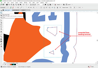 Because my interest was only with the outer (red) line, I needed to remove the unwanted lines (in black). To break apart these welded lines, select the lines and go to Object>Break Apart or use Ctrl+K as a shortcut. After deleting the black lines, I still had a few inner red lines that were unnecessary. To delete these areas, I again broke apart (Ctrl+K) the red line and deleted those lines. These can also be deleted using the Shape tool (F10) by dragging over all the nodes of the lines to be removed and pressing the Delete key (FIGURE H).