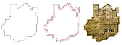 I was recently tasked by a client to design a mock-up for a custom cutting board resembling a map of my hometown, Sioux Falls, SD, that included a drip edge (FIGURE L). After I created the vector shape of the cutting board, I needed to create the drip edge that would follow the inside of the shape. Here again, the Contour tool made it easy to create. After selecting the premade graphic, I used the Contour docker to create an inside contour with one step/line about .375 inches inside the perimeter. This new line could then be used by a laser or plotter cutter to cut the channel.