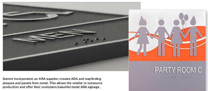 ARA member Gemini International is among suppliers offering completed ADA signage. Anyone can get cheap, generic ADA signs from office supply companies; Gemini sets themselves apart by offering solid metal ADA and wayfinding plaques and panels. ADA requirements, the company emphasizes, don’t mean that signage shouldn’t look good.