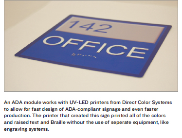 Normally, you’d have to complete the sign in multiple steps with multiple pieces of equipment. That’s not the case with DCS’s printers and ADA module. The UV-LED printer not only prints ADA compliant colors but also the raised elements, including Braille, pictograms, and lettering. “We’re talking about a complete sign from beginning to end,” said Matt Sands, software development analyst and technical sales for Direct Color Systems.