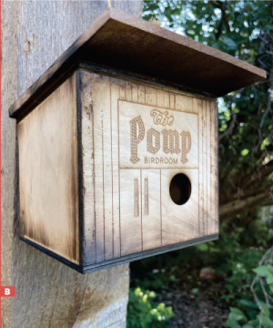 I found an image online and used CorelDRAW to recreate the look of the entrance of the building (Figure C). Using a reference guide from the bird book, I calculated the size of the birdhouse and the size of the opening to attract a smaller variety of bird, like a finch or chickadee. Then, using CorelDRAW again, I made the necessary vector lines for cutting out the walls, floor and top (Figure D). The material used is birch plywood and can be sourced at the nearest home improvement center or online, if necessary. I had some leftover cedar shingles that worked handily as a roof for the birdhouse, ensuring that the birds would keep dry while also protecting the structure from wind, rain and sun.