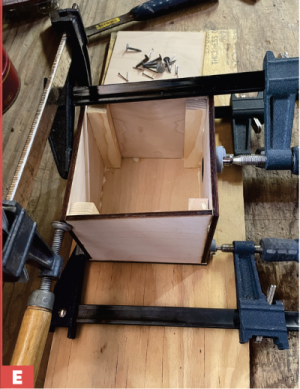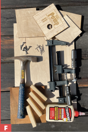 After vector-cutting the parts of the birdhouse from the birch plywood, I used a few wood tools, wood scraps (as inside support), wood glue, screws and nails to create the overall structure (Figure E). Tools and materials are shown in Figure F.