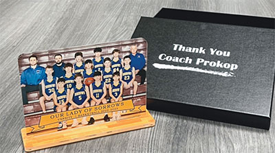 Mark Jaroh, owner, JF Awards, used UV printing and laser cutting to create a year-end award for his son's basketball team.