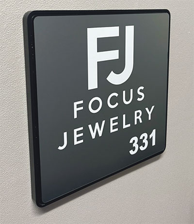 A wall sign for an office suite from MJ Awards made by laser cutting silver plastic and UV printing with a glossy top coat.