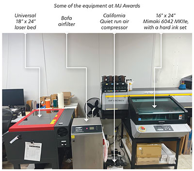 Jaroh uses a Mimaki 6042 and a 60-watt Universal laser. He  added the UV printer to his shop about a year ago after hearing that his  corporate clients wanted to see their logos in full color on acrylic awards.  “The UV printer is an expensive machine, but it pays for itself just in the  colorization of the company’s logos on awards,” he says. “It allows me to do  personalized awards in full color for my clients.”