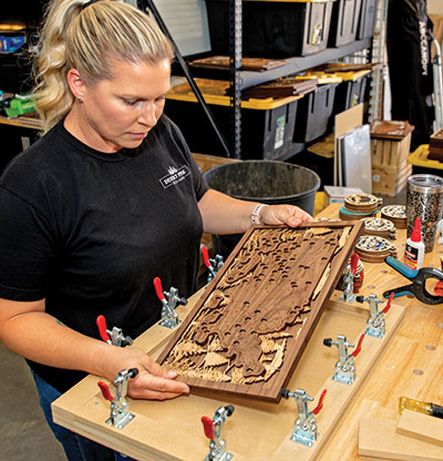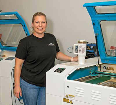 “Once that started happening, I began to really try to nurture that side of the business and put much of my attention toward it,” she says. She purchased her second laser this year to keep up with all the orders she makes in her studio, a 2,400-square-foot shop she and her husband built next to their house, which is actually smaller. And the orders keep rolling in. Her clients range from businesses to individuals to schools.