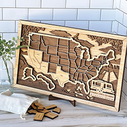Cleveland has found ways to offer personalization items at the markets as well. She recently bought a small laser that she takes with her so she can personalize items for customers in minutes. An example is her wooden travel maps, which are her biggest seller at the markets. They include a badge that can be personalized with a name and a quote or anything the customer wants.
