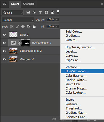 Once all the  pixels needing modification have been selected, create a new adjustment layer (figure  D). Because this new layer is created with the selection active, a mask  will be automatically applied to the layer. Only the areas that are white  inside the masked selection will be affected.