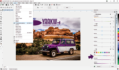 To modify the  colors on an image in PHOTO-PAINT, select the cyan areas of the Jeep with a  combination of the Freehand Mask and Magic Wand Mask tools.