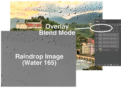 To best  illustrate what these Blend Modes can do, see figure D. Here, a  grayscale image composed of raindrops has been added to the layer above the  photo and set to Overlay at 100% opacity. That Blend Mode layer was then  duplicated several times to magnify the effect (figure E).