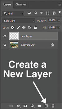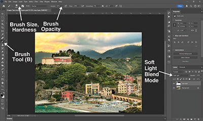 To do this,  create a new layer above the original by clicking the Create a New Layer  button, (figure F) or use the shortcut Ctrl+Shift+N or Cmd+Shift+N on a  Mac. Select the paint brush from the Tools panel (B) and set the Hardness  slider to 0% and the size appropriate to the area being fixed. Change the paint  color to black (for contrast), and set the new layer to either Overlay or Soft  Light mode (figure G). Start clicking and dragging with the Brush Tool  (B) in the new layer over the foggy mountains. The change will be immediate and  satisfying, especially with the amount of control that these tools have.