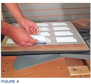 One way to increase production is to use a jig. You will find that many sublimation products you are familiar with have jigs associated with them. Device cases, badges, and coasters are a few of the items that you will find that can be used with jigs. The advantage to using a jig is that you can easily layout multiple products in a way that matches the design template in your graphic design software. In this case, the jig (shown in use in FIGURE A and FIGURE B) and template file (FIGURE C) are for a Unisub® iPhone® Switchcase™.