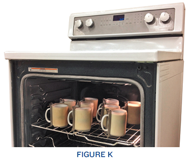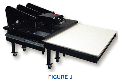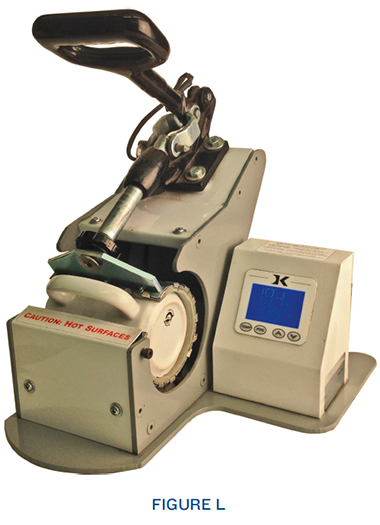 Another way to increase production is to incorporate large equipment into the process—large-format printers, large-format presses (FIGURE J), and conveyer dryers (for mugs). You can acquire the right equipment to match the production level you need. For example, FIGURE K illustrates mugs being sublimated in a convection oven. This would be a midsized step up from a single mug press (FIGURE L) but smaller in scale than a conveyor dryer. You can increase mug production from 50 to 60 per day with a mug press to 150 per day in a convection oven, or produce thousands per day with a conveyor dryer (FIGURE M), depending on the brand/model.