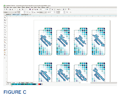 Using the Print Merge feature in CorelDRAW is a huge time-saver when your design is staying the same but each product has to display a different name. (Flip back to Figure C to see a sample of this.) If you try to do this by hand—copying, pasting, and reformatting text or, worse, retyping everything—you are increasing the risk of error and consuming a lot of your valuable time. In a nutshell, Print Merge allows you to automatically pull the data from the customer’s Excel file into a design template. Not only does it place the names and titles into the correct spot, but also it automatically changes the text to the correct typeface/font and size and fills the page with as many units as it can fit onto the document size you are using. Nice, huh?