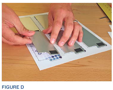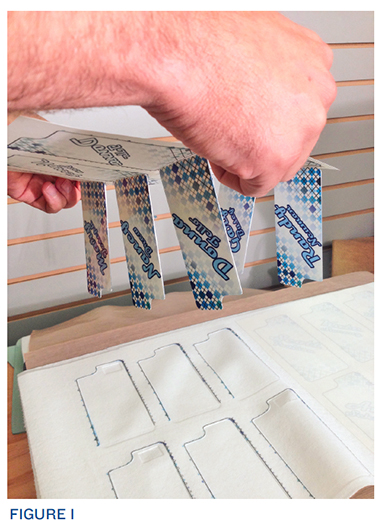 For device cases and other small products, you can be a minimalist with tape. In FIGURE I, I used one strip of tape along the bottom of the device cases so I could easily flip them immediately off the transfer when they finished sublimating. This technique eliminated the need to tear the transfer off and helps prevent ghosting (getting a double image on the product).