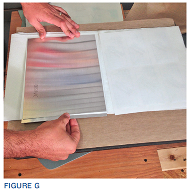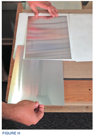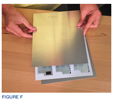 The alternative to using a jig is to align the products on the transfers by eye and by hand (FIGURE D). The benefit to this method is the added certainty that the product is centered correctly onto the transfer, but it is more time consuming. That extra time may not be a problem on a smaller order, but multiply the extra seconds on a giant order, and you’re losing time and money on a grander scale. One technique you can employ if you are aligning these by hand is to use the “aluminum sandwich.” If the product needs to be in the press with the transfer on top of the product, you need a handy way to flip the transfer over after placing and taping them to the transfer (FIGURE E). Use two pieces of aluminum (sized to fit the transfer) on the bottom and top of the product and transfer to create your aluminum sandwich. Transport these to the press (FIGURE F), flip the sandwich over, and lay the sandwich in the press. Next, carefully slide the aluminum sheet from the bottom (FIGURE G) and remove the top aluminum sheet (FIGURE H).