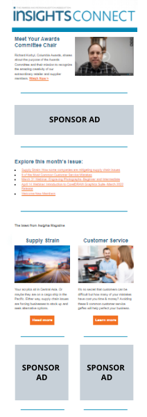 Reserve a banner ad in Insights Connect to be positioned among highly valued monthly content reaching more than 3,500 personalization retailers via e-mail.